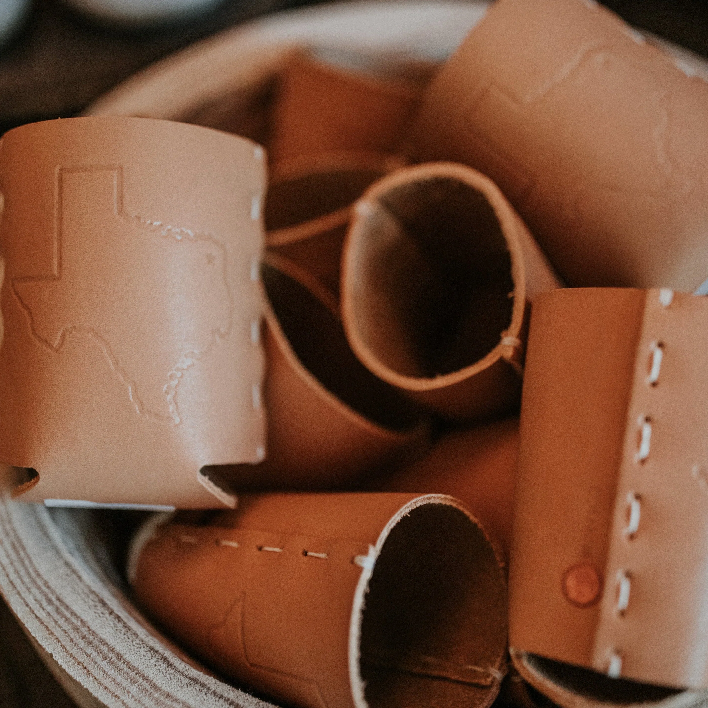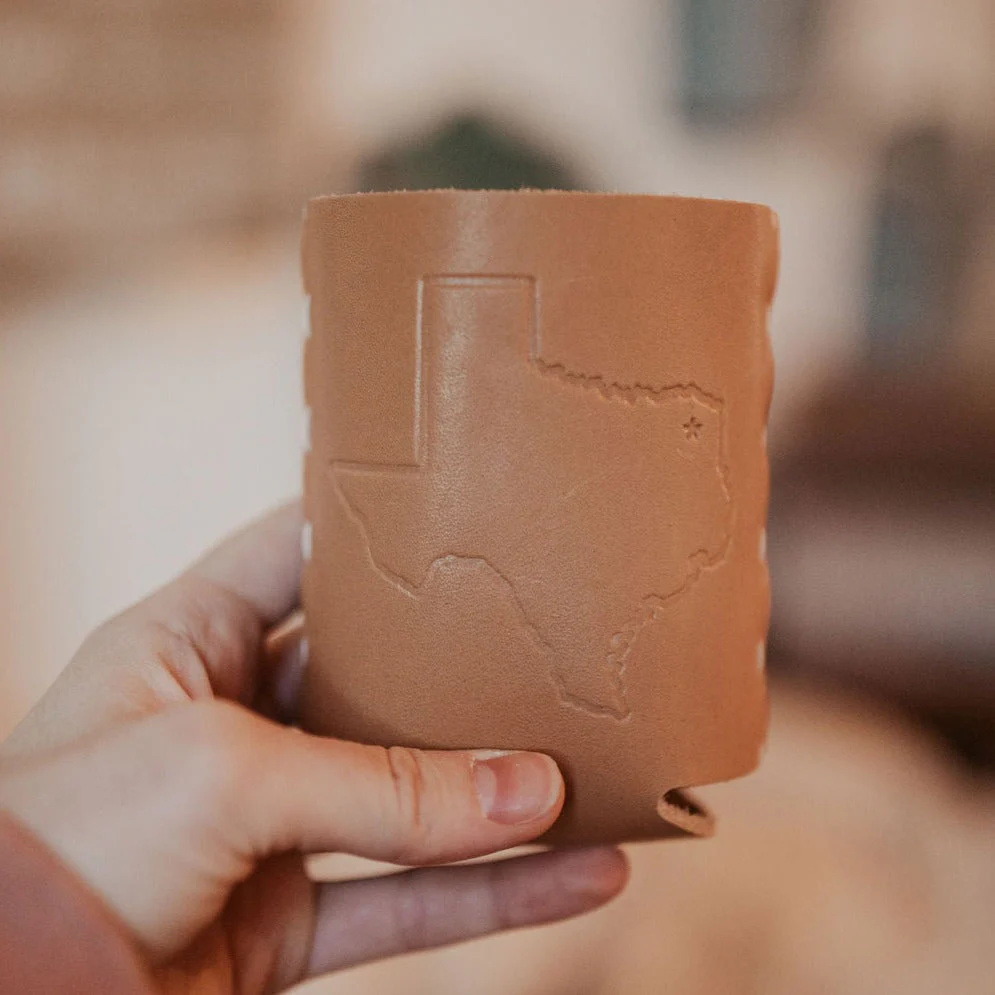 Show your Texas pride while enjoying your favorite cold beverage with this authentic leather Texas State Can Jacket. Hand-stitched in the United States and embossed with the iconic shape of Texas, this piece blends craftsmanship, durability, and timeless style. The natural tan leather develops a rich patina over time, making each jacket uniquely yours.